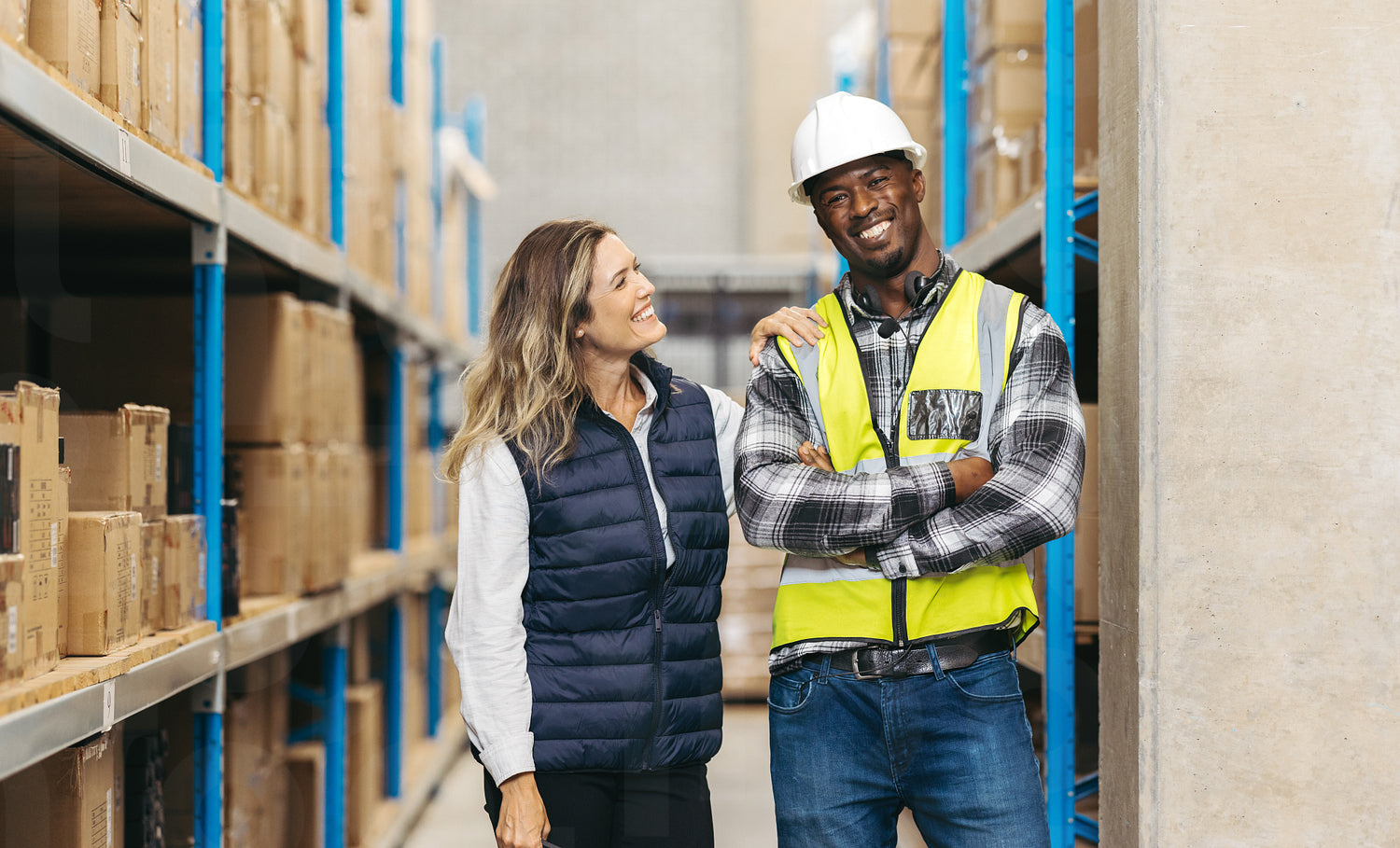 Warehouse employees smiling happily while standing together in between storage shelves. Two cheerful logistics workers working together in a large distribution centre.
