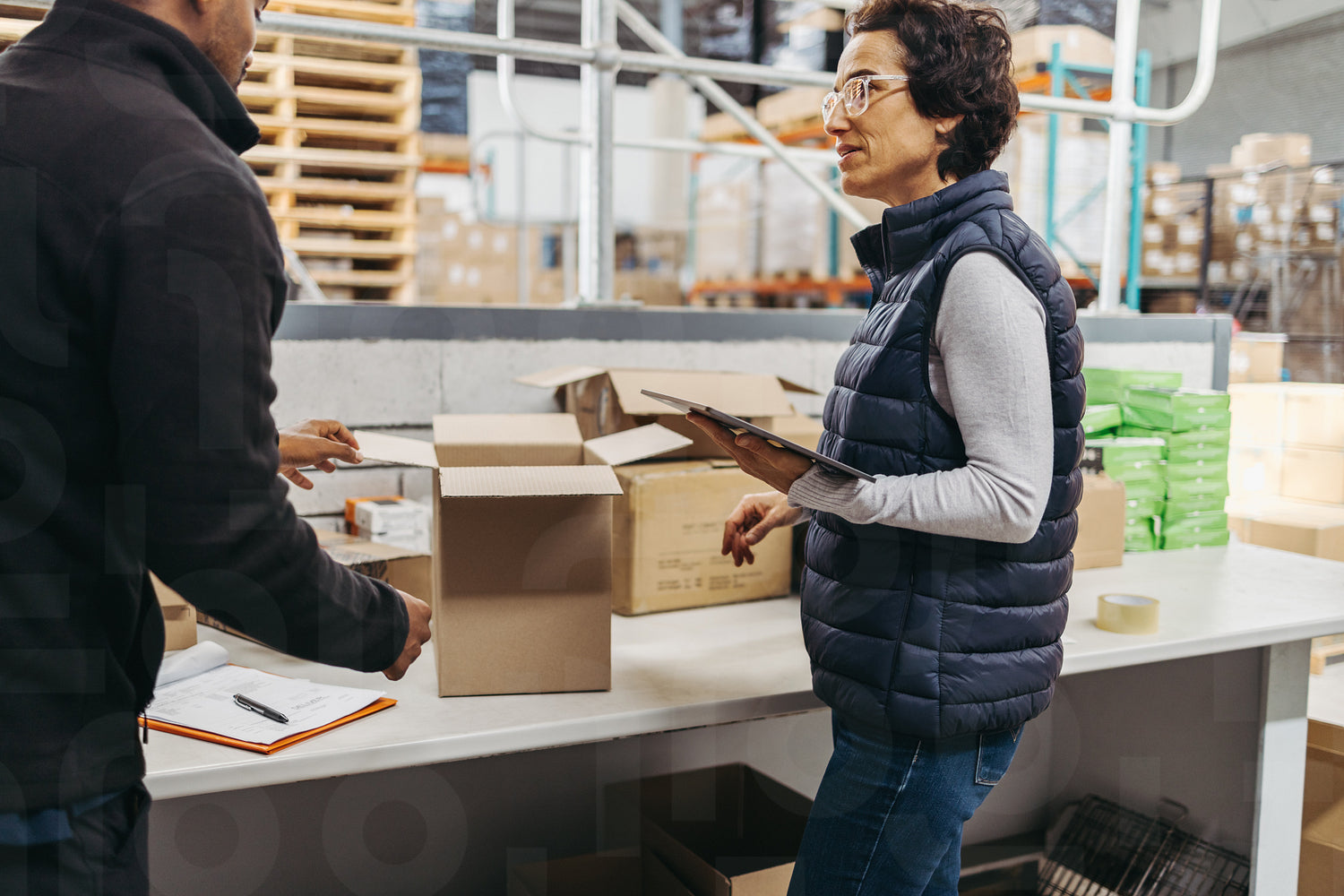Warehouse manager and trainee fulfilling online orders