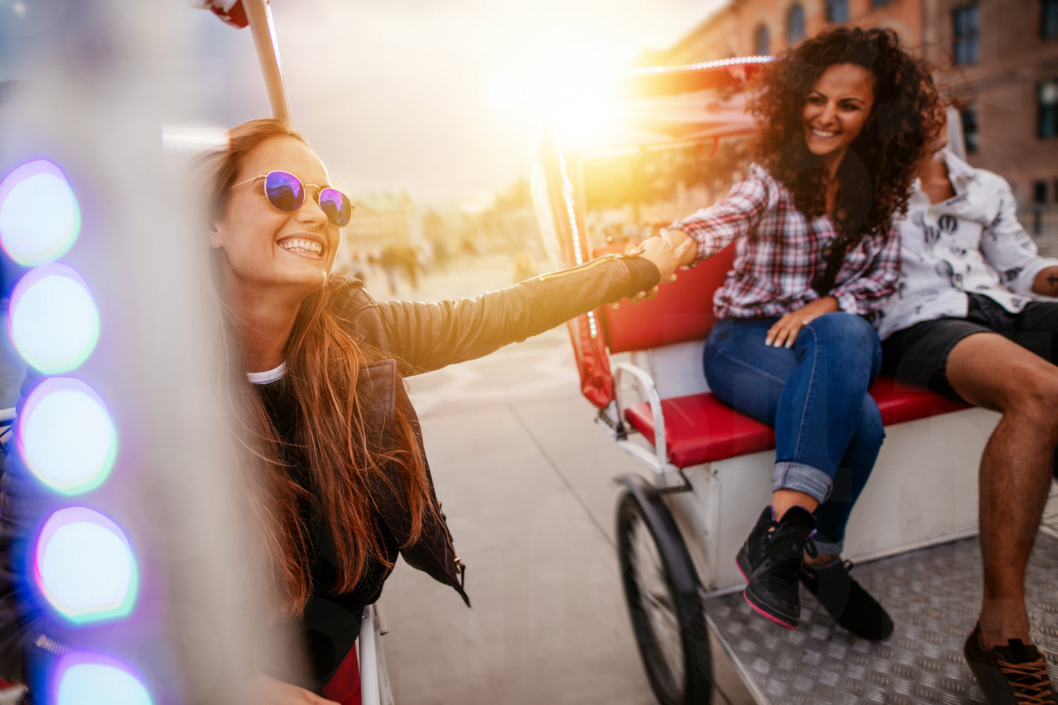 Best friends enjoying tricycle ride in the city. Teenage girls riding on tricycles and holding hands.