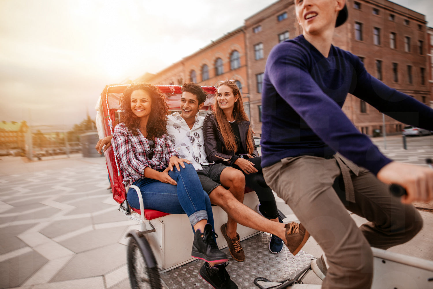 Group of teenagers traveling on tricycle in the city. Young men and women riding on tricycle on road.