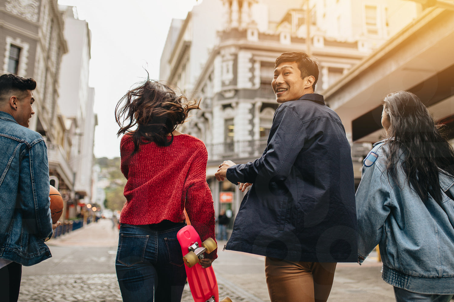 Rear view of a smiling asian man turning back while walking outdoors with friends. Four young people having fun outdoors on road.