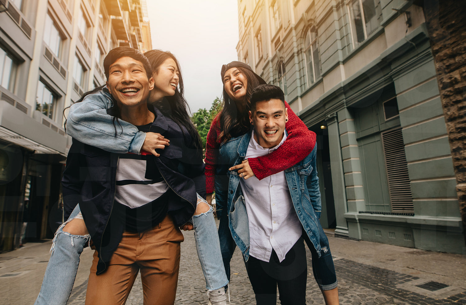 Two young asian men carrying women friends on their back on city street. Group of friends piggybacking outdoors on city street.
