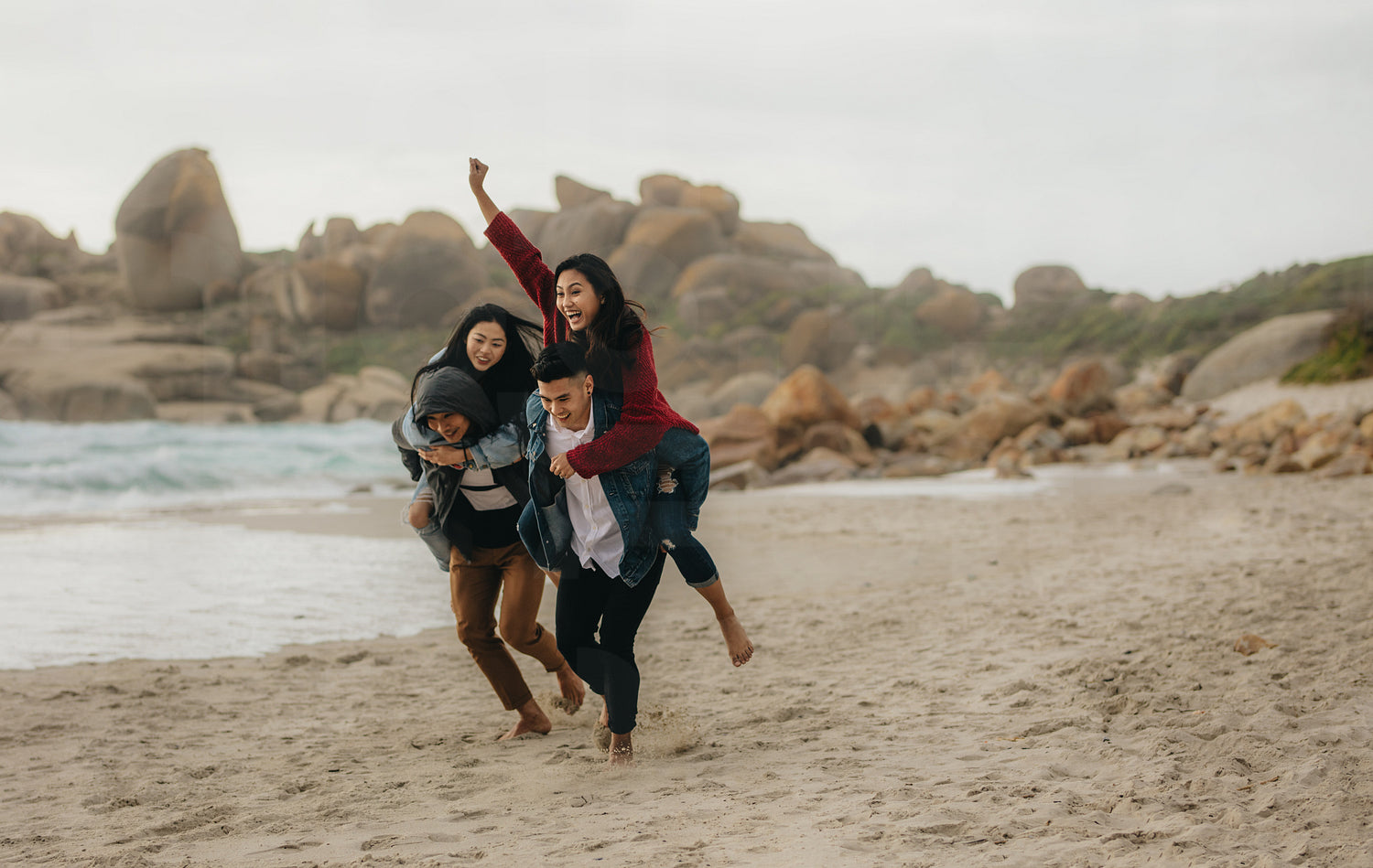 Two young men giving their girlfriends piggyback rides. Group of young people enjoying themselves during summertime at the beach.