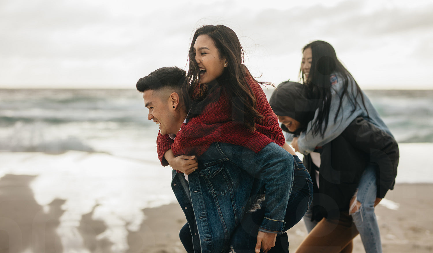 Young men carrying female friends on their back along the sea. Group of friends piggybacking outdoors on the seashore.