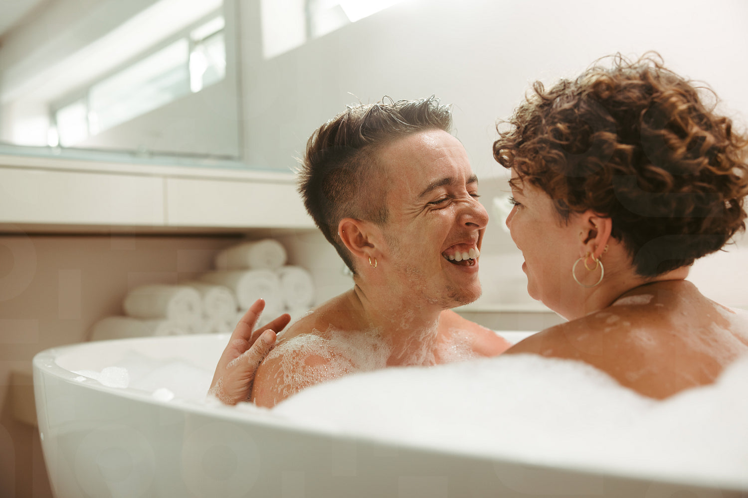 Carefree young queer couple having a romantic bubble bath at home. Happy young couple having fun together in the bathtub. Young LGBTQ+ couple spending quality time together in the bathroom.