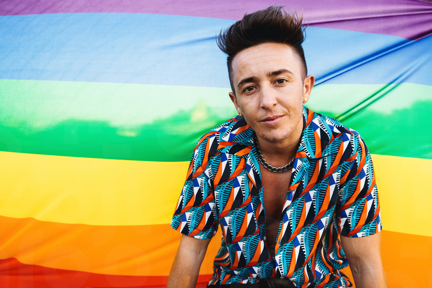 Transman embracing his gender identity. Young transgender man looking at the camera while standing against a pride flag. Queer man posing against the LGBTQ+ flag.