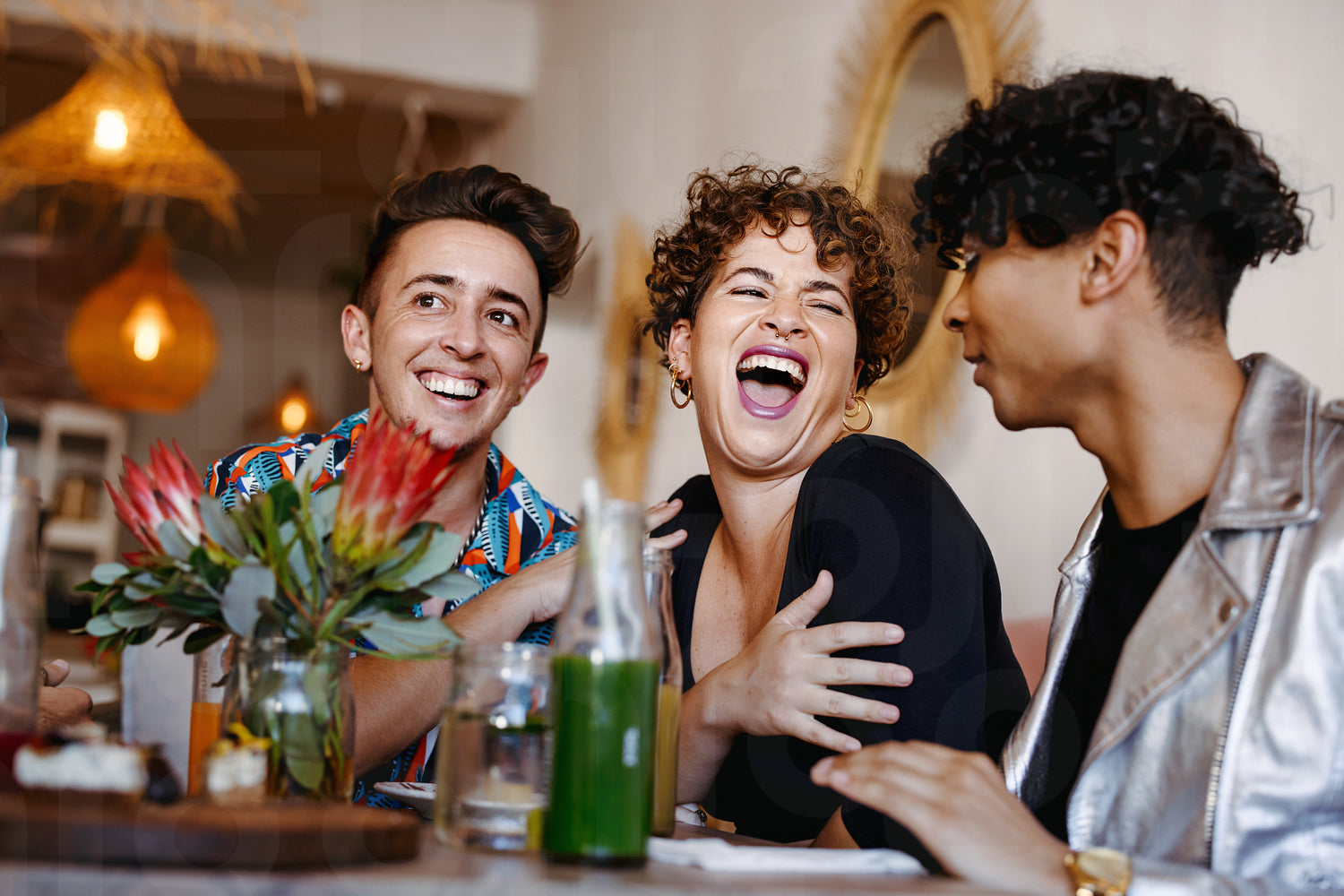 Young group of friends laughing cheerfully in a restaurant. Four young queer people having fun together during lunch. Friends bonding and spending time together.