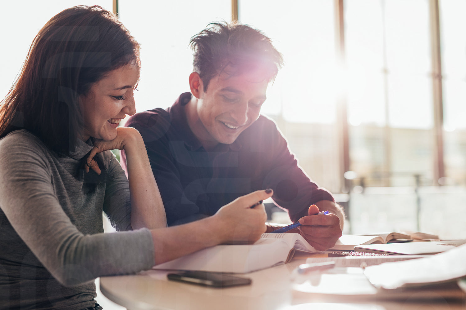 Happy young male and female students reading a book together in class. University students studying together in library.