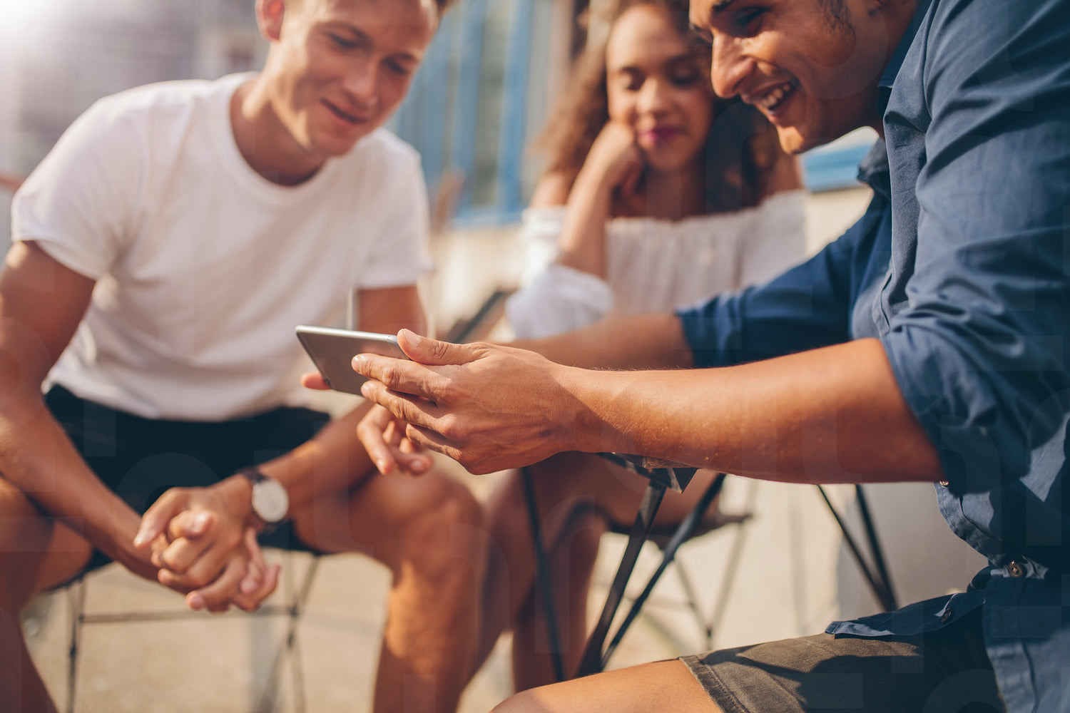Young people sitting outdoors and looking at mobile phone. Group of friends sitting at outdoor cafe and watching video on the smartphone.