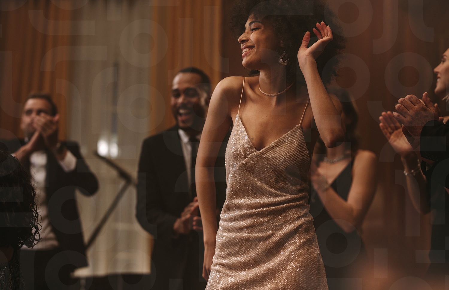 Beautiful african woman dancing at gala event. Female in evening dress enjoying dancing at party with friends around.