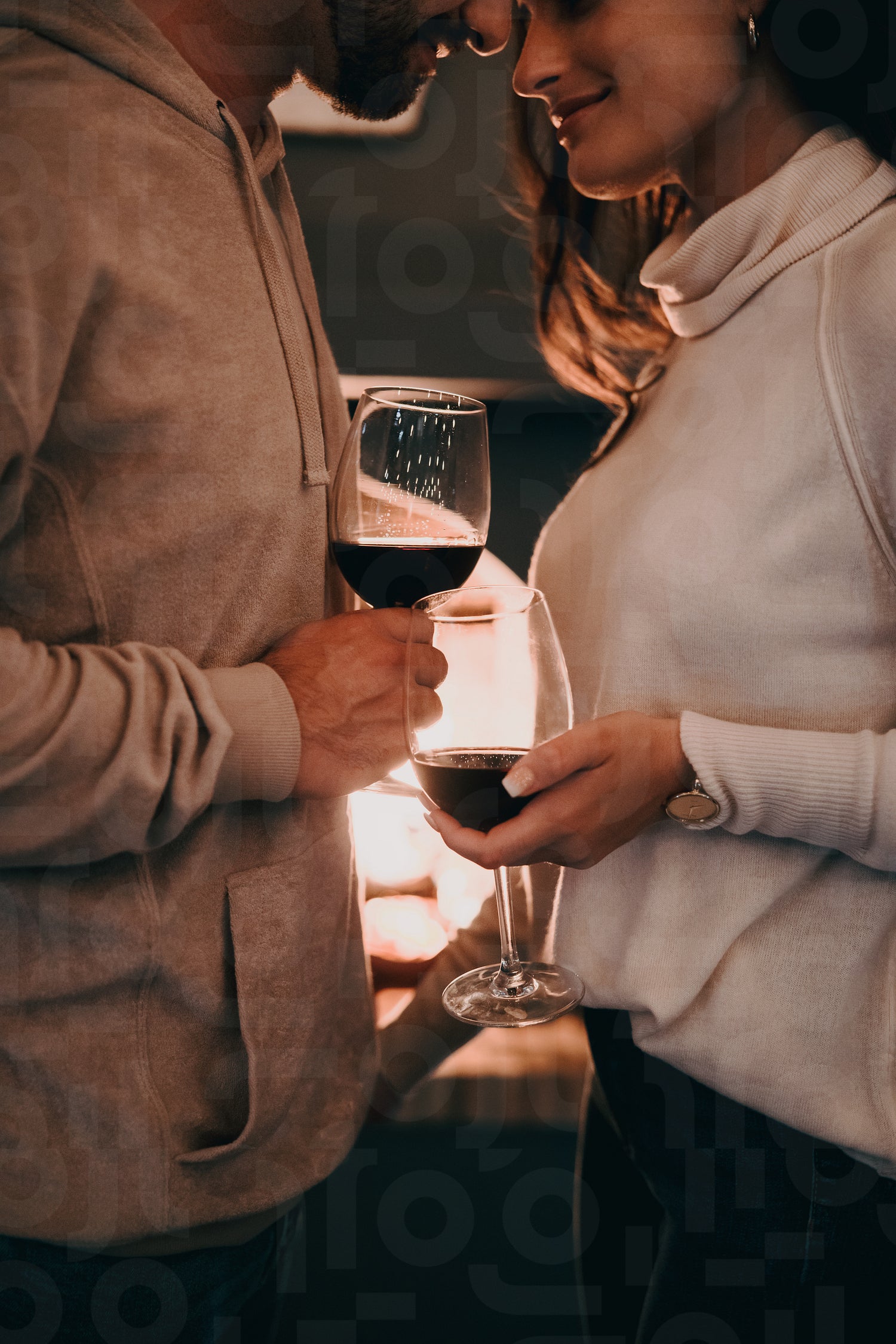 Young couple sharing a romantic moment on their vacation. Two affectionate young lovers holding wineglasses while standing in front of each other in a luxury hotel. Young couple bonding on their honeymoon.