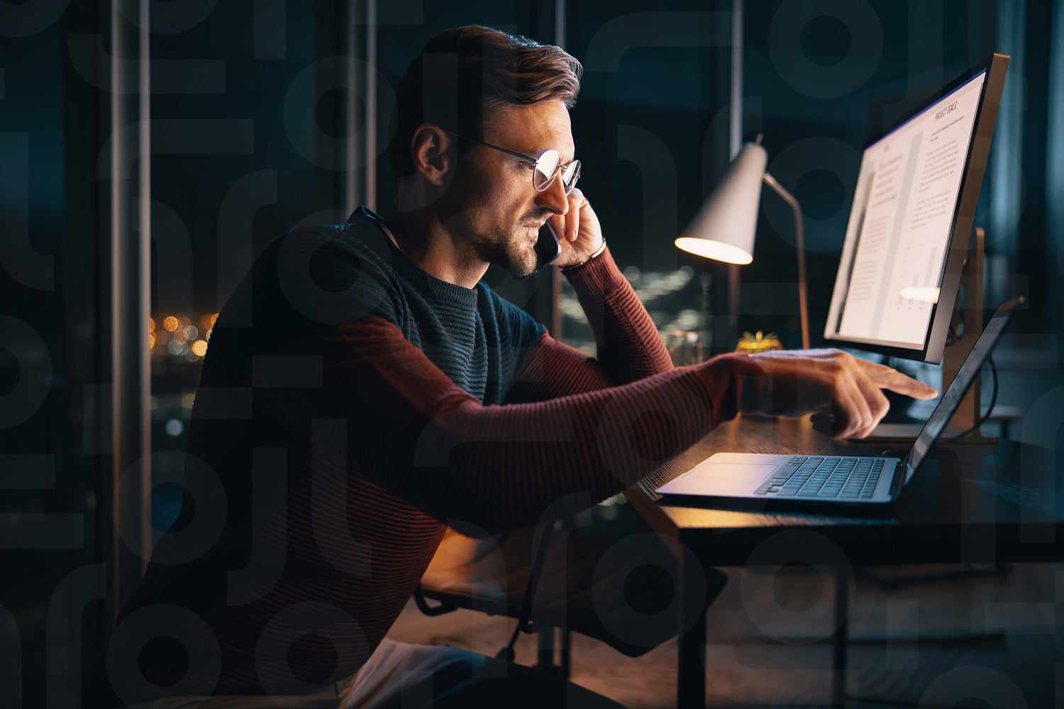 A caucasian businessman works late at night in an office, discussing a project over the phone. He is focused and determined, balancing technology and communication for success.