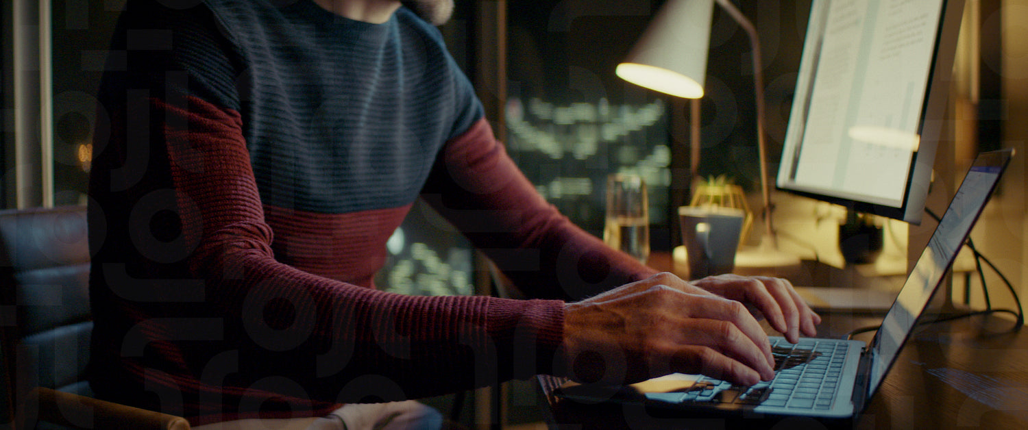 Focused man sits in a cozy, nearly dark office. He taps out edits to a project, committed to delivering his best work regardless of the time. Shot on anamorphic lens in 2.39:1 Cinemascope format.