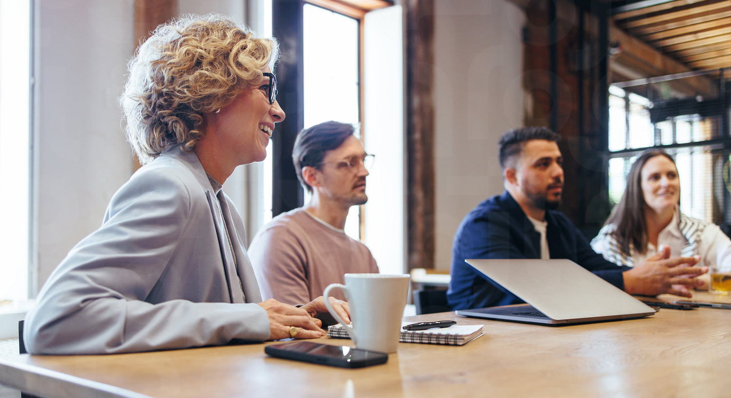 Business discussion in a conference meeting, business people sit together on a table in an office. Team of business professionals collaborating on a project.