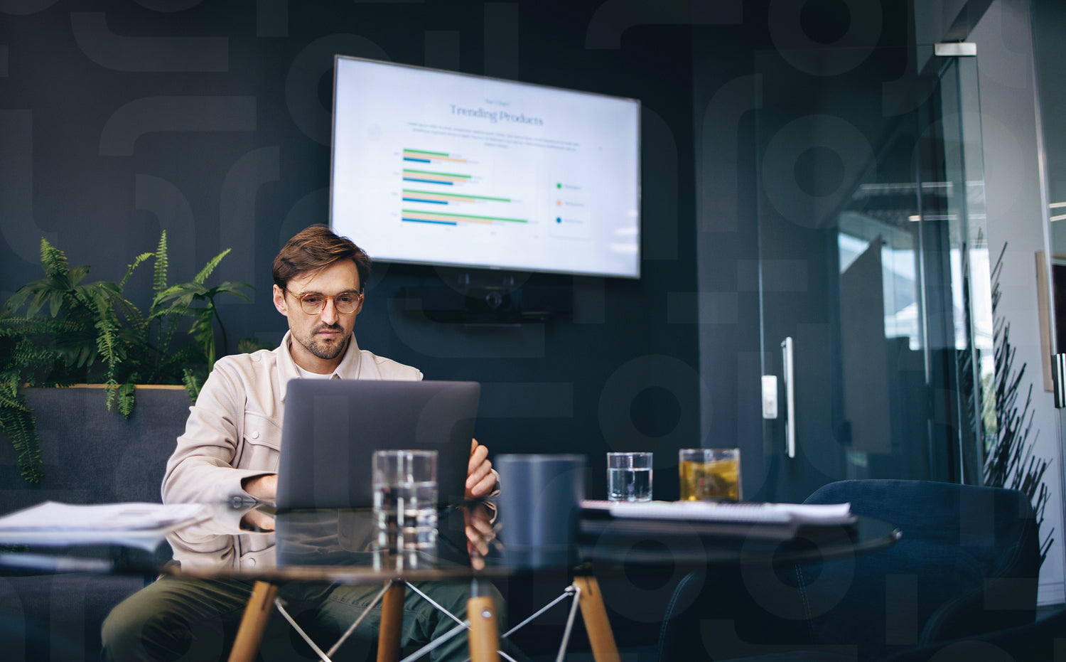 Business man using a laptop, preparing to give a report on his market research before a conference meeting