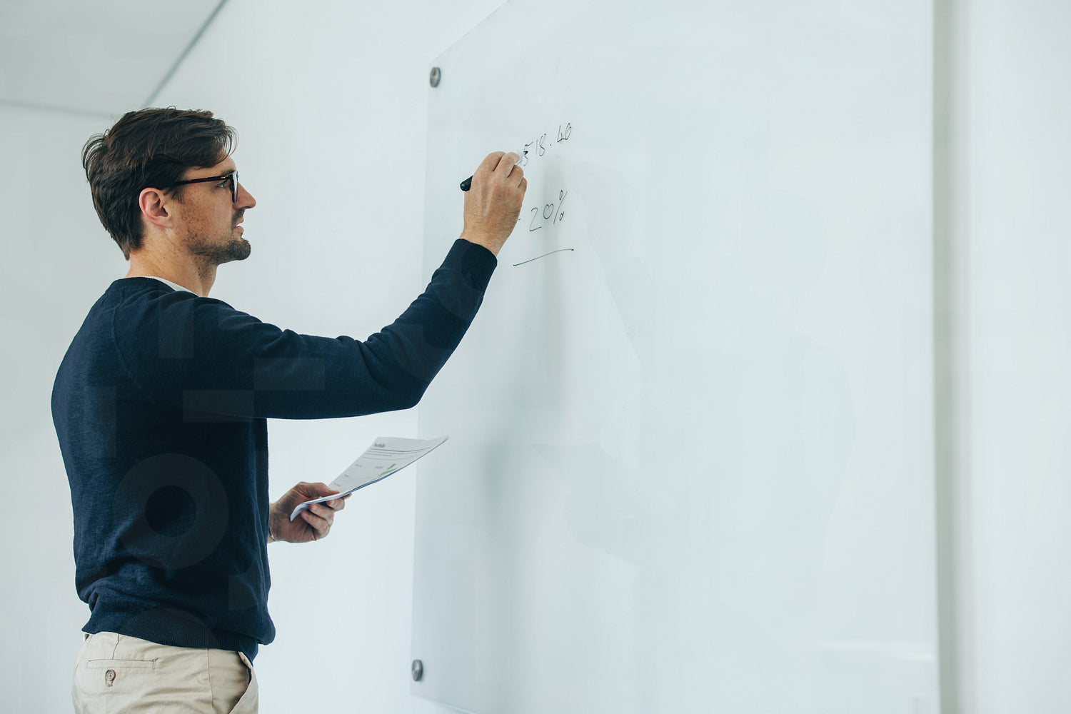 Business man leading a meeting at his workplace, doing a presentation and writing figures on a white board. Male business professional engaging in brainstorming and financial planning at work.