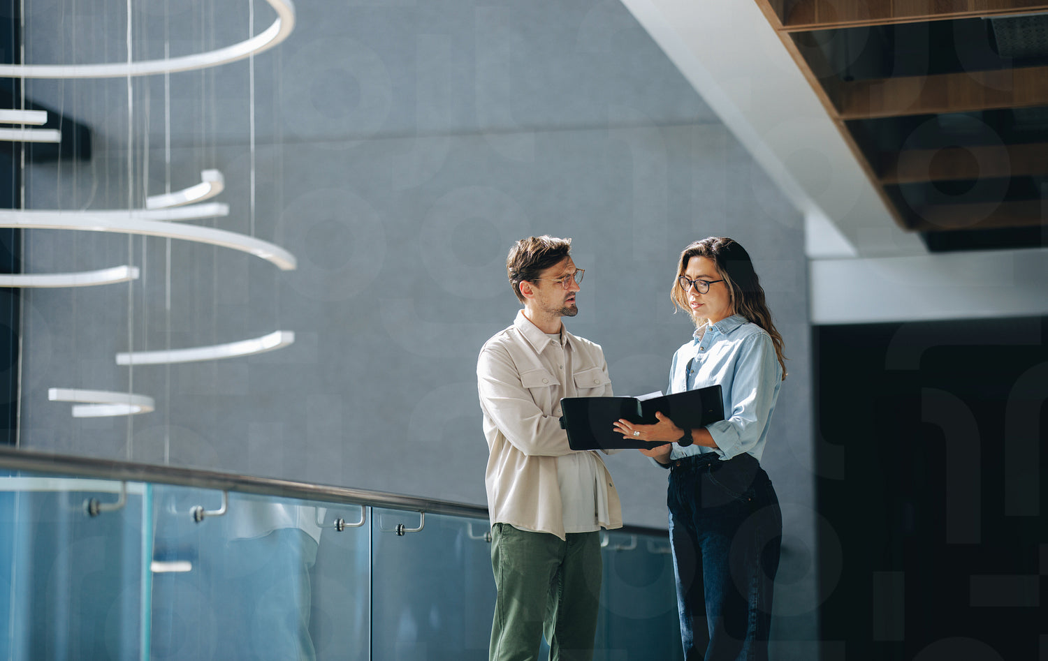 Two business partners, male and female, have a detailed discussion as they review a document together. Professional business people negotiating the terms of their partnership in an office.