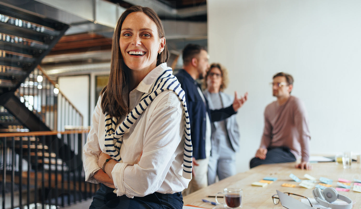 Business woman in her 30's looking at the camera in a boardroom. Business woman having a meeting with her team in an office. Female professional working on a project with her colleagues.