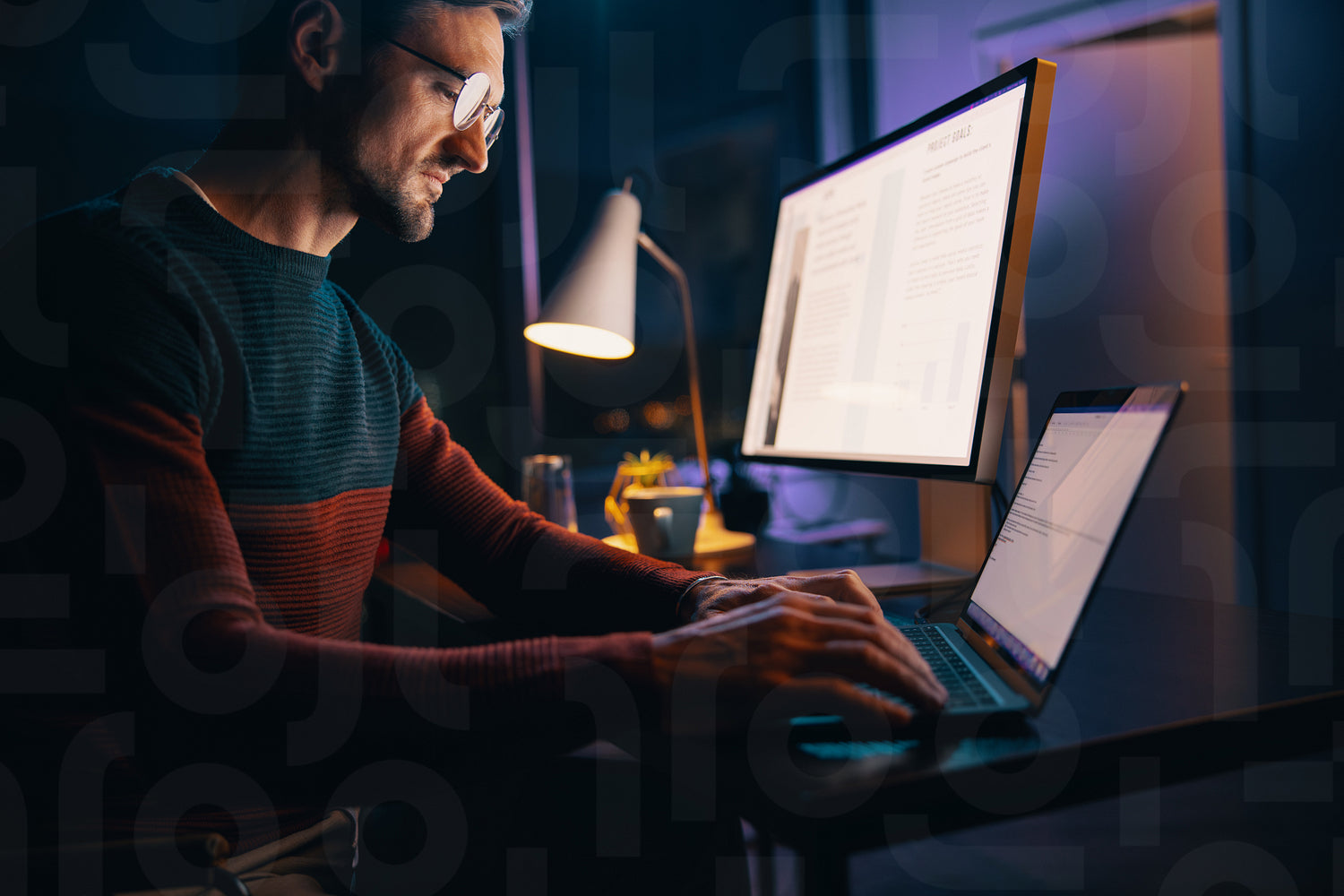 Caucasian man working late at night in his home office, engaged in a project using a laptop. Business man using technology to achieve after-hours productivity in remote work.
