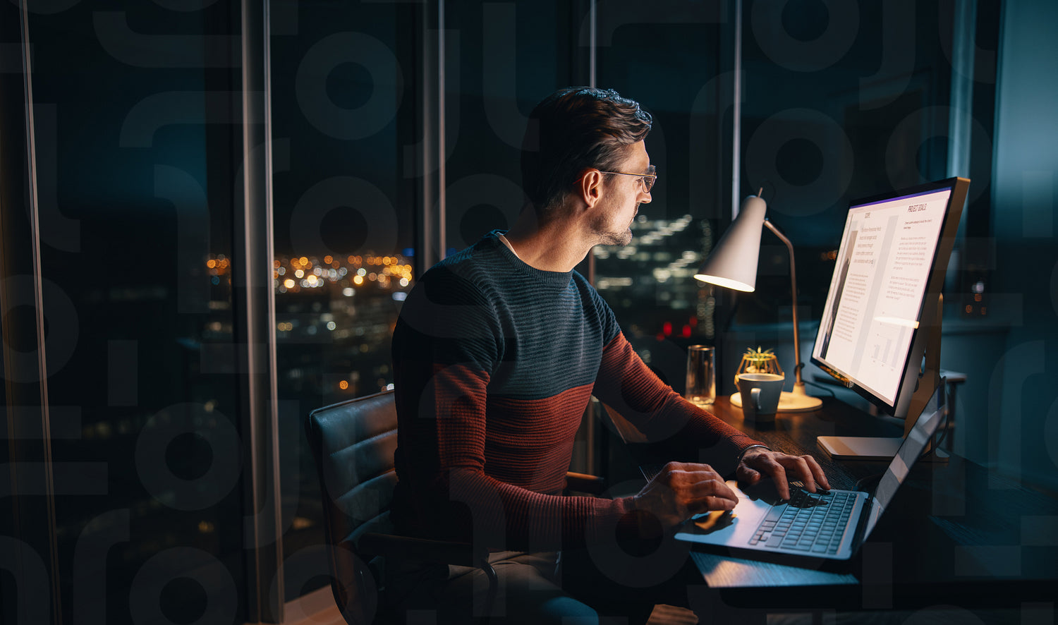 A focused businessman works late in a well-lit office, typing on his laptop. Surrounded by a busy workplace, he diligently focuses on a marketing plan, driven by ambition and dedication.