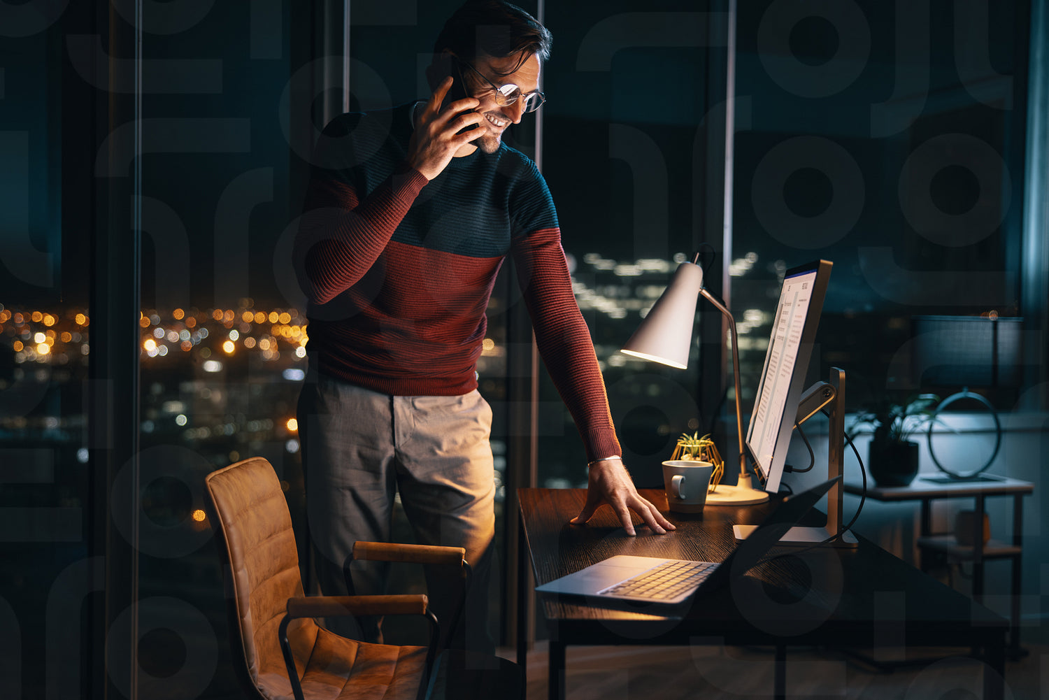 A smiling businessman works late in his office, making a phone call and using his laptop for project planning. He embodies dedication, professionalism, and work-life balance in the modern workplace.