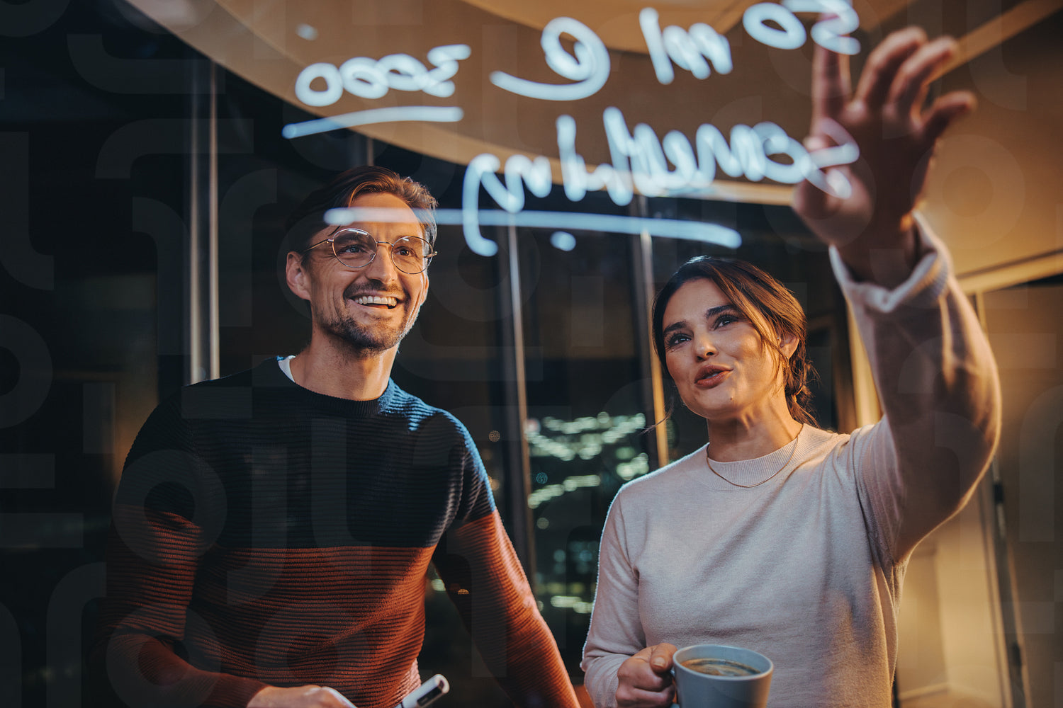 Two business professionals have a late-night discussion in an office, collaborating and brainstorming behind a glass wall. Financial analysts working together after hours, boosting their productivity.