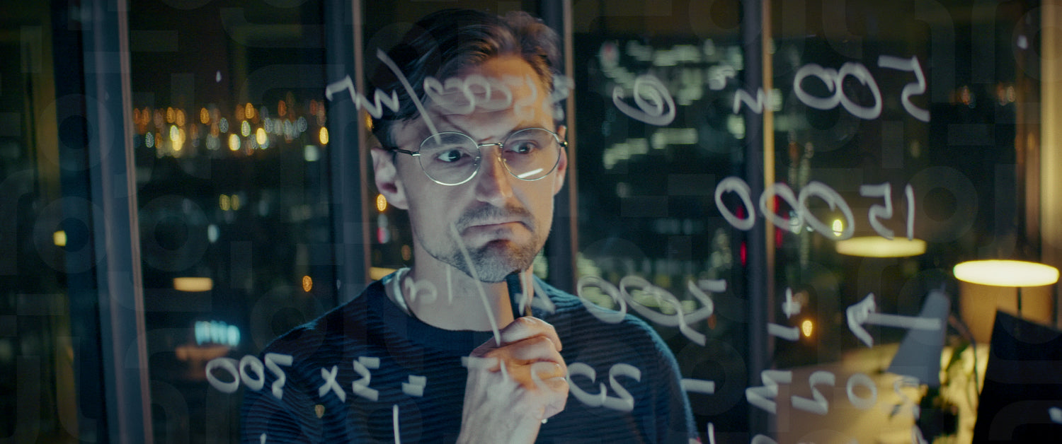 Thoughtful man in his 30s writes on a clear board in a modern office at night. He breaks down data sets and writes formulas with laser focus. Shot on anamorphic lens in 2.39:1 Cinemascope format.