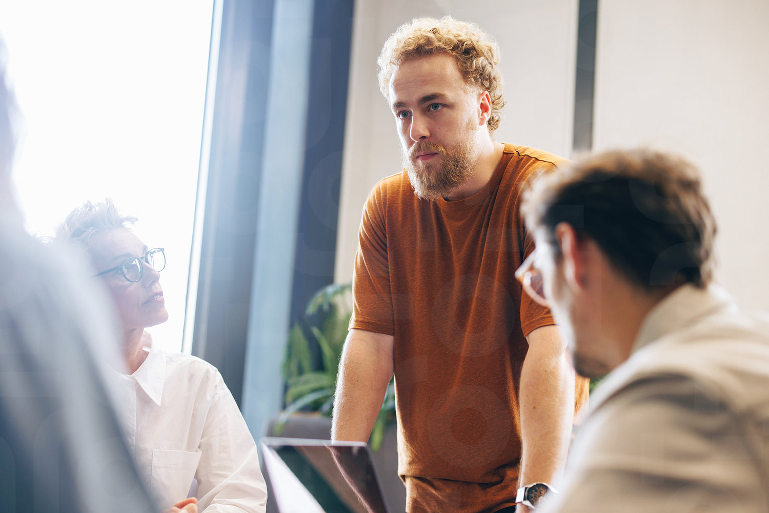 Young business man taking the lead in a team discussion during a business meeting. Business man standing up to address his colleagues and present his vision for the company.