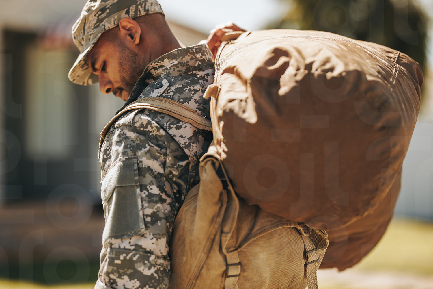 Brave serviceman carrying his luggage outside his home. Rearview of a patriotic American soldier coming back home after serving his country in the military.
