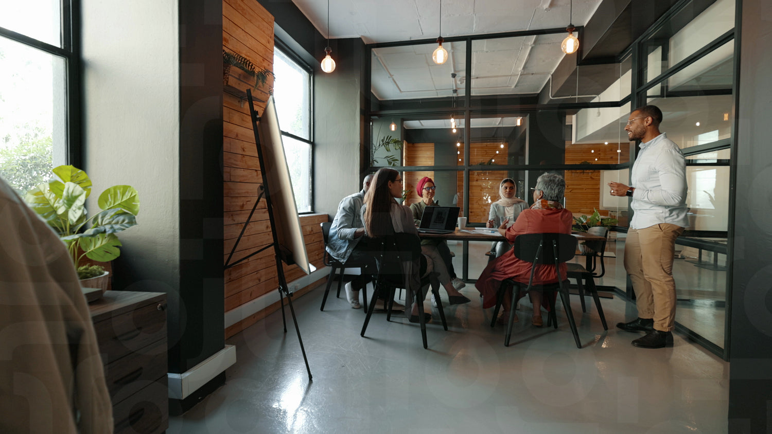 Collaborative meeting in a coworking office: Business ma having a discussion with his team in an office