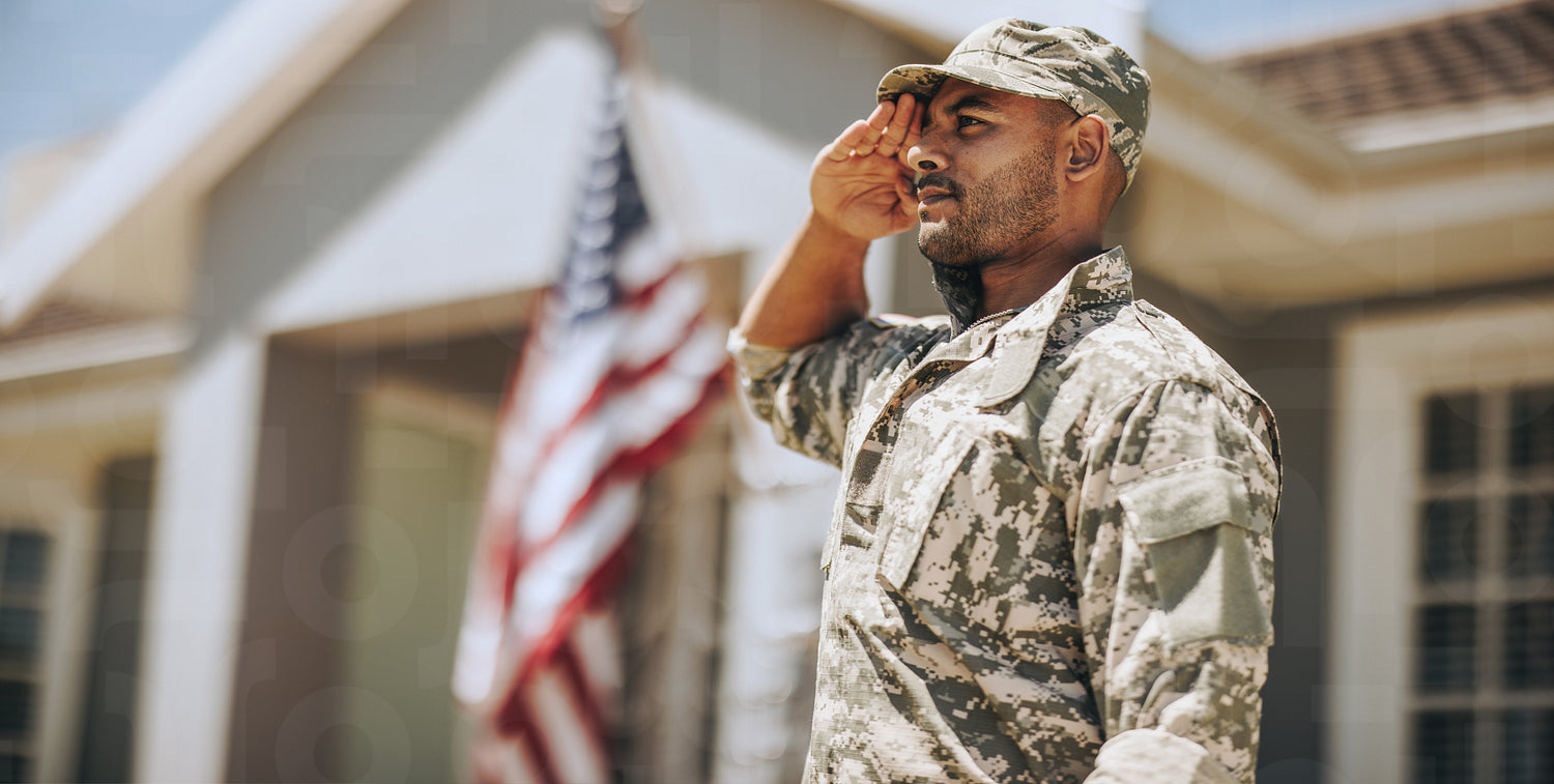 Patriotic young soldier saluting while standing outside his home. Member of the United States Marine Corps showing honour and respect on Veterans Day.