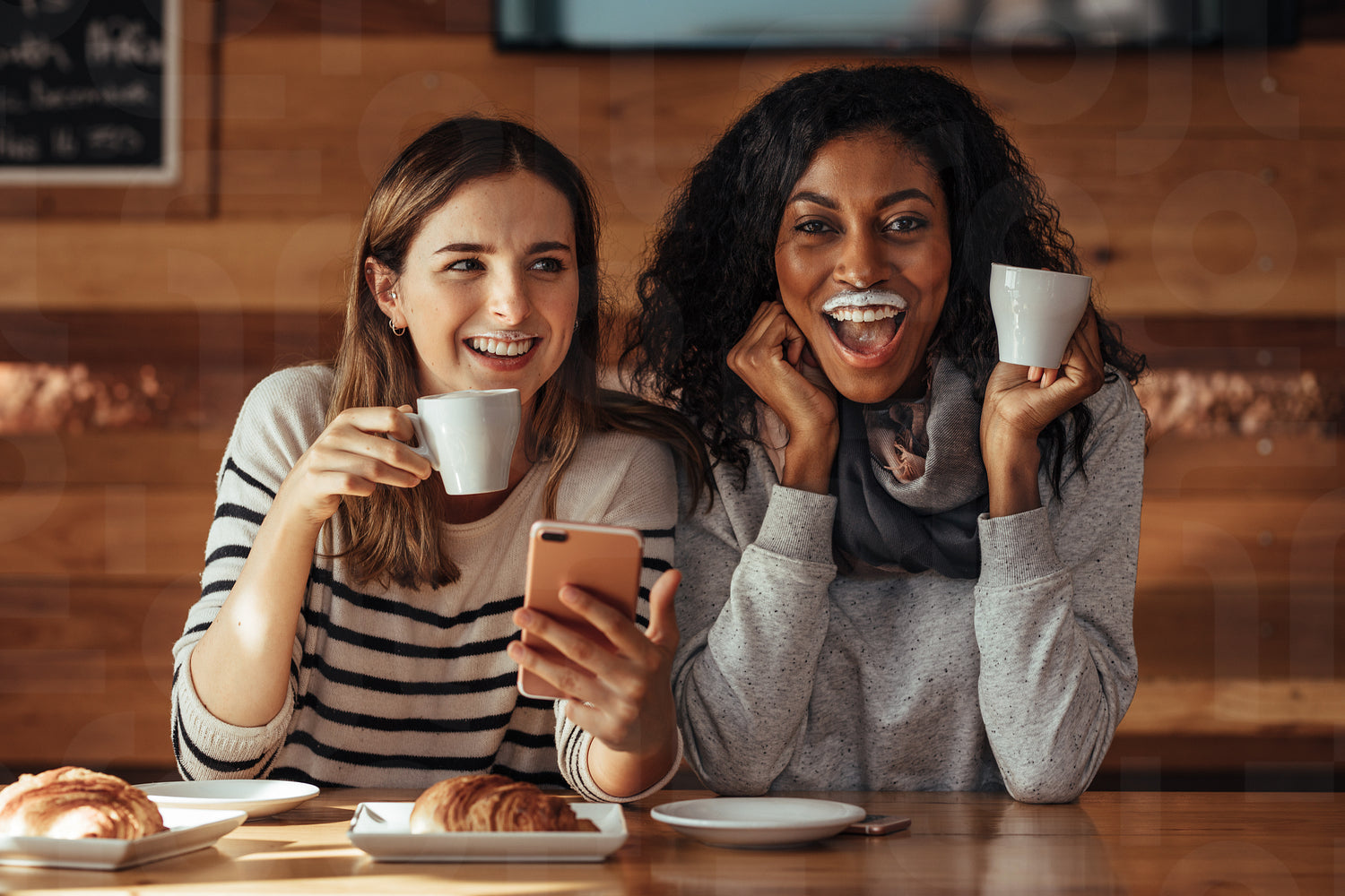 Two women drinking coffee and smiling with a milk mustache in coffee shop. Friends sitting at a cafe with coffee and snacks on the table holding a mobile phone.