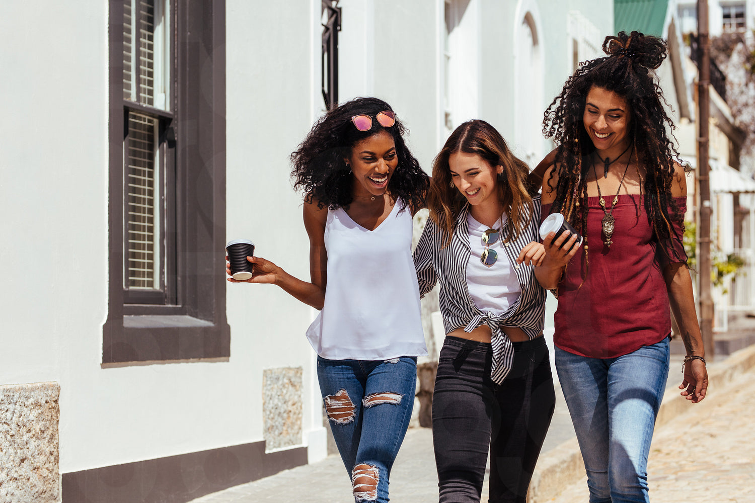Three women wearing fashionable clothes walking on street holding coffee glasses.
