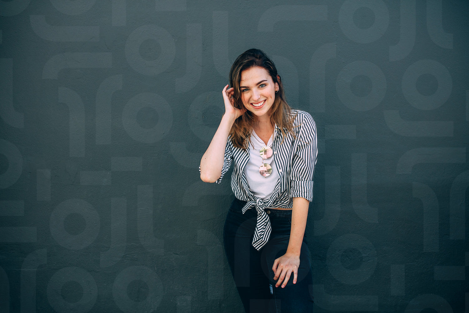 Portrait of a smiling woman wearing fashionable clothes standing against a wall. Happy looking woman standing against a wall.