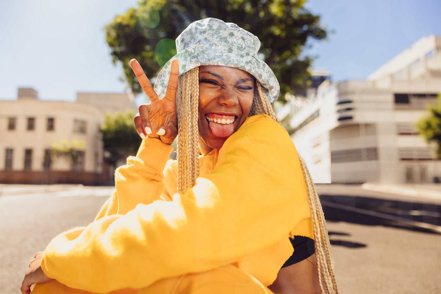 Carefree young woman making the peace sign while sitting outdoors on a summer's day. Happy young woman having fun and smiling at the camera cheerfully. Young women wearing long white braids.