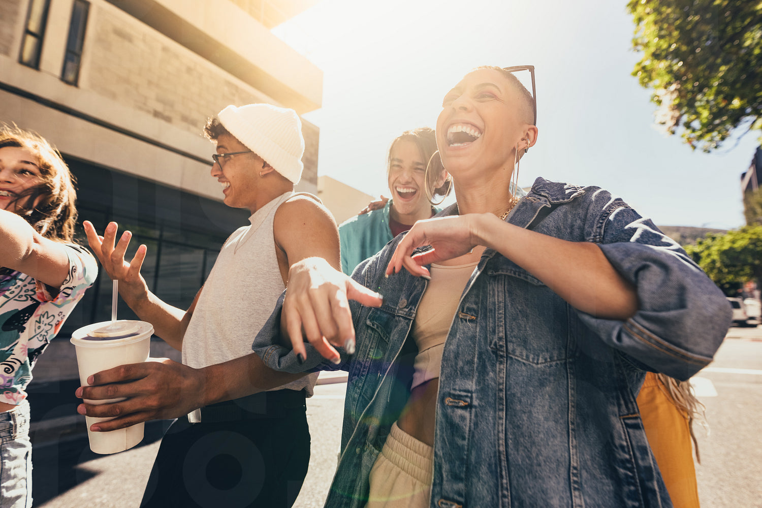 City friends having fun together. Group of generation z friends laughing while walking together in the summer sun. Cheerful youngsters having a good time and enjoying their youth.