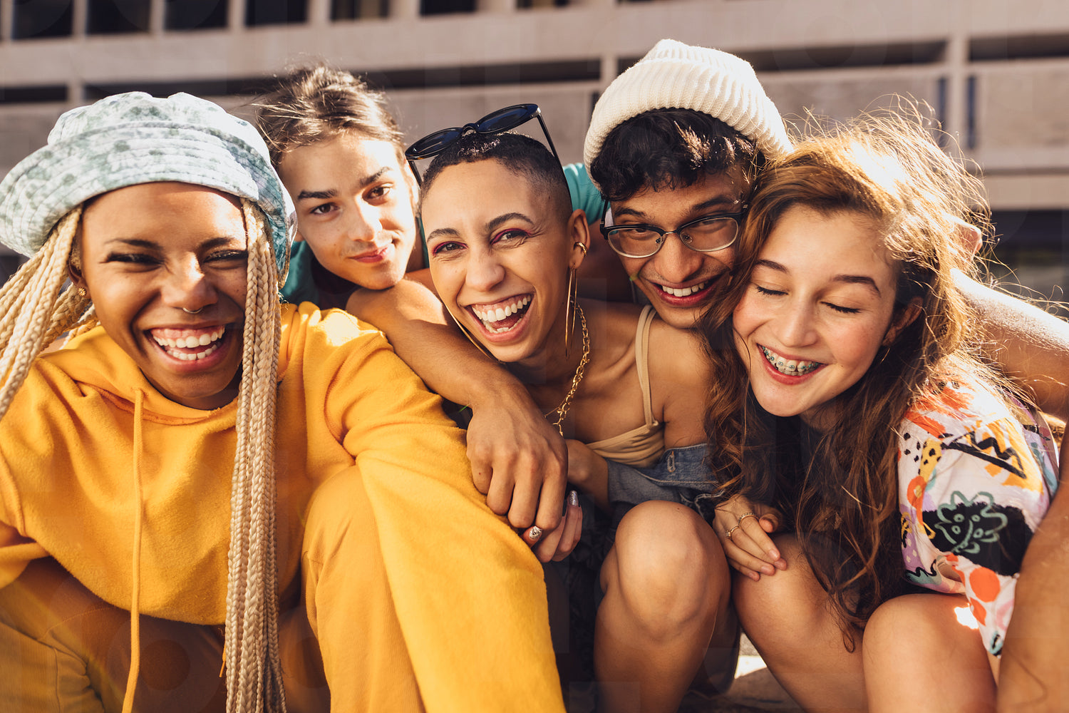 Enjoying some quality time with friends. Group of generation z friends laughing cheerfully while hanging out together outdoors in the city. Happy young friends having fun together in the summer sun.
