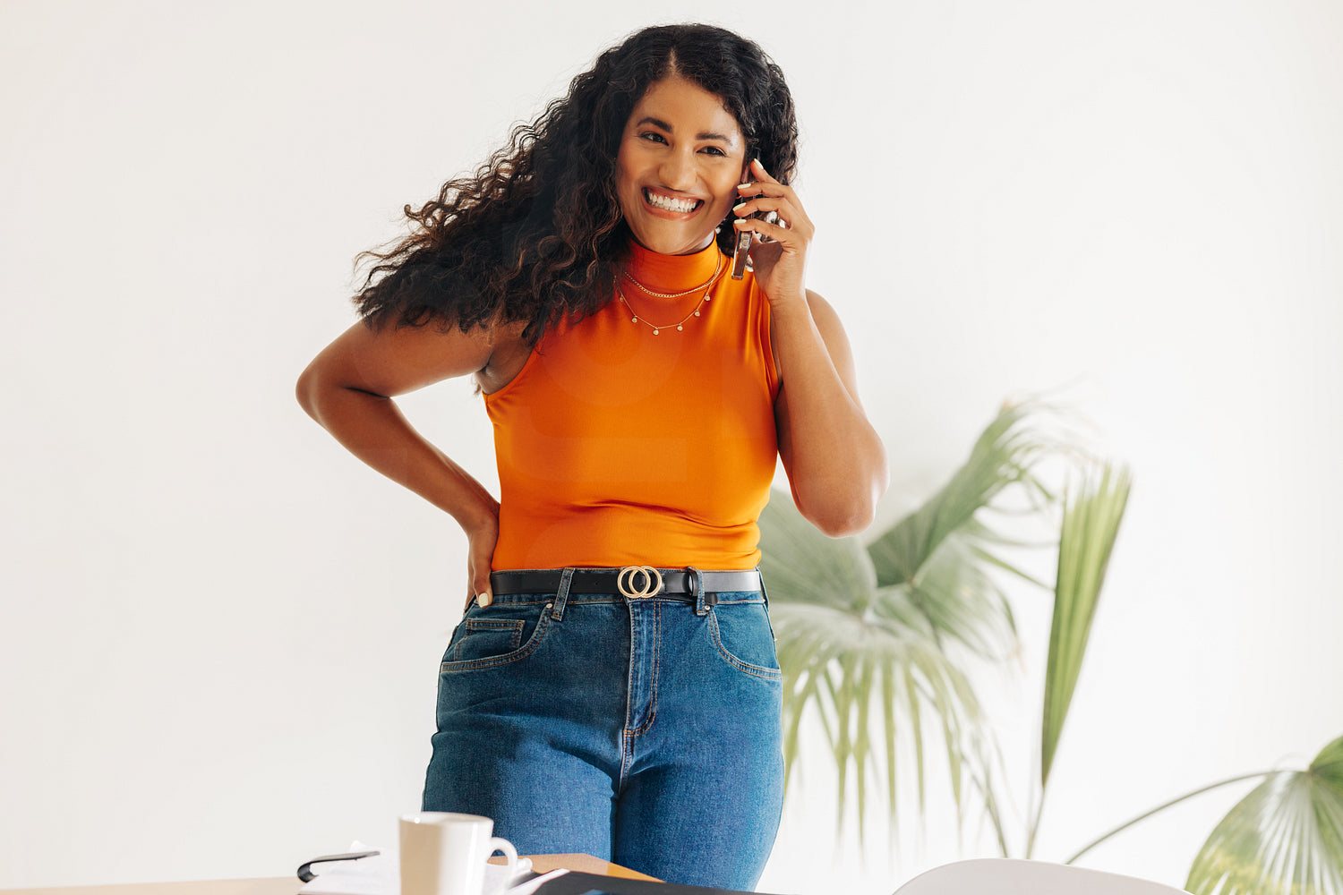 Cheerful young businesswoman smiling happily while speaking with her business partners on a phone call. Young businesswoman making business plans while standing in a modern office.