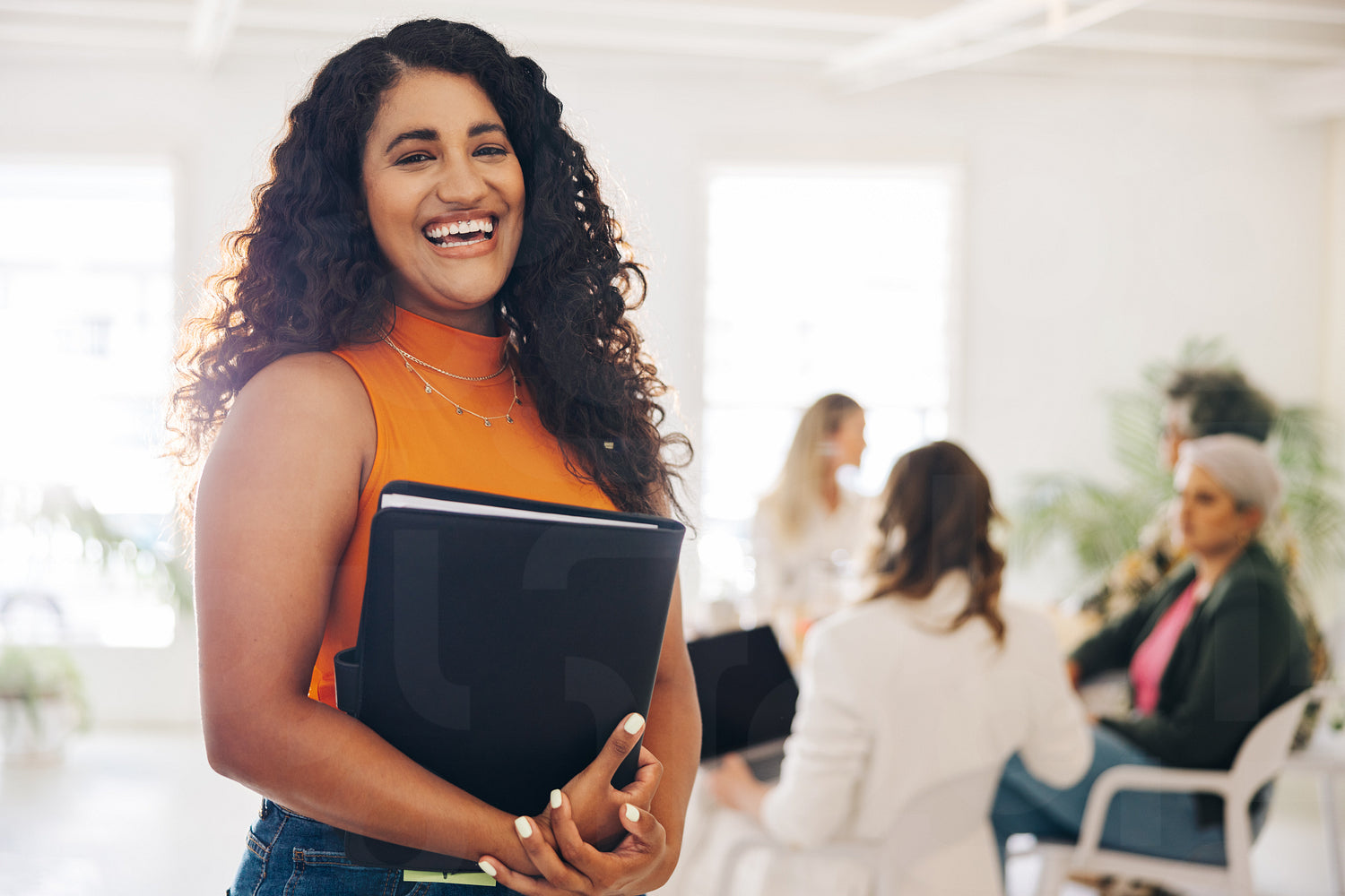 Happy young businesswoman smiling at the camera while standing in a boardroom. Cheerful young businesswoman attending a meeting with her team in an all-female office.