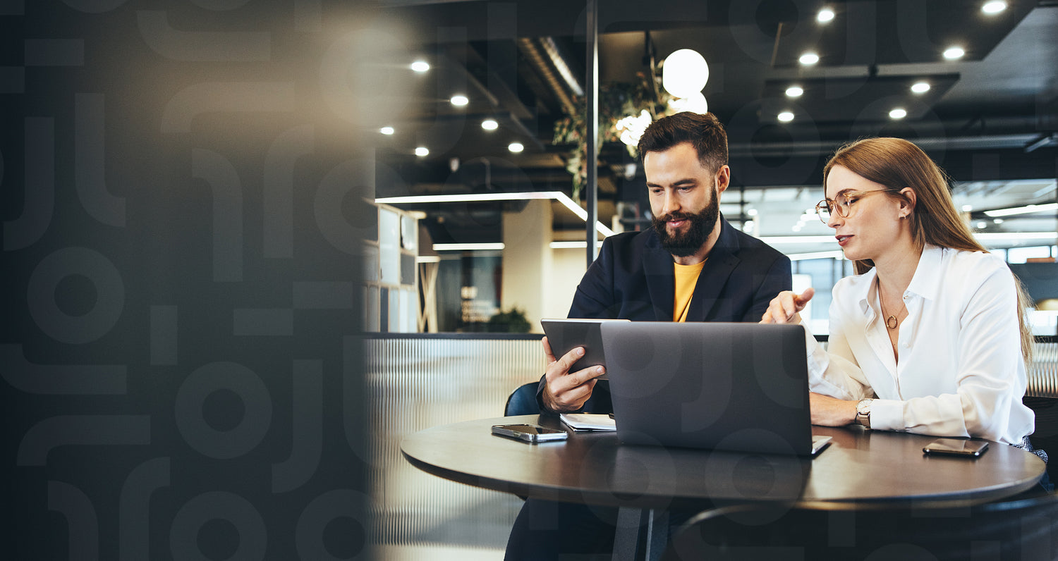 Two young entrepreneurs using a digital tablet while having a discussion in a modern workspace. Two young businesspeople using wireless technology while working together in an office.