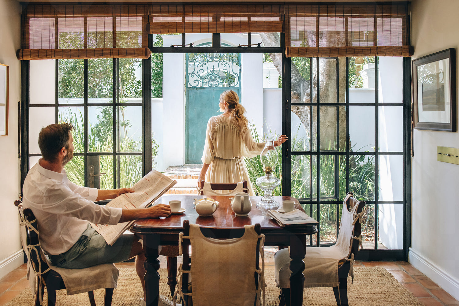 Couple enjoying a lovely morning in a hotel. Woman standing at the entrance of a hotel with her husband reading a newspaper indoors. Married couple vacationing at a luxury hotel in the summer.
