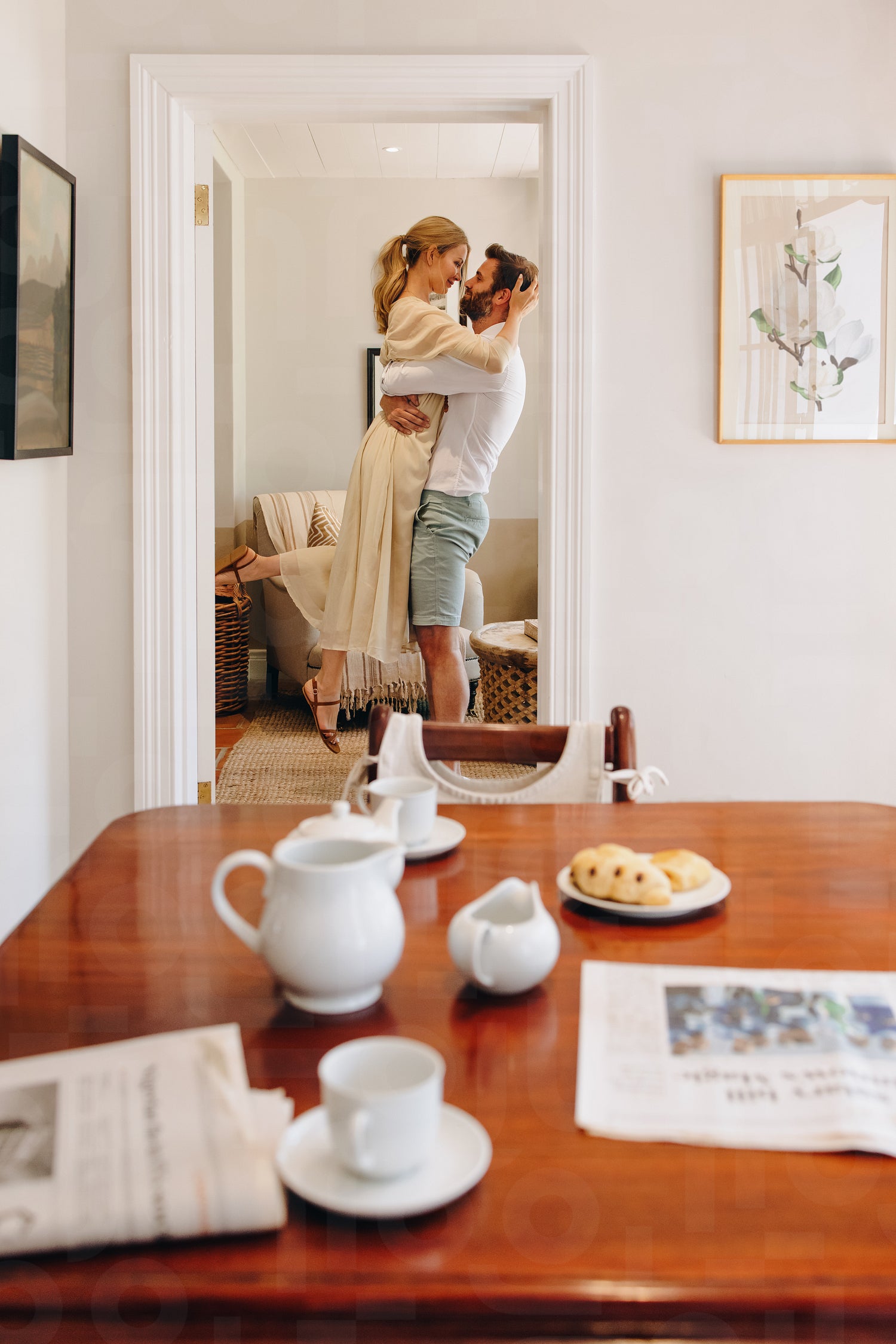 Marital bliss. Happy woman laughing cheerfully while being lifted by her husband indoors. Romantic married couple enjoying a lovely summer morning while vacationing in a luxury hotel.