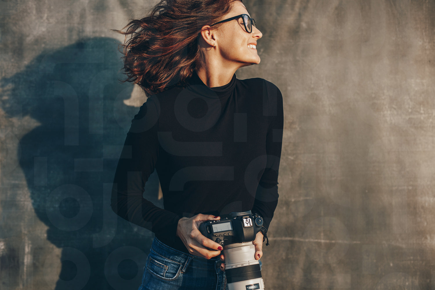 Beautiful female photographer with a professional camera against muslin backdrop. Cheerful young woman photographer with digital camera.