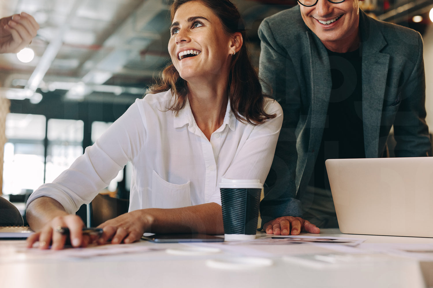 Smiling businesswoman sitting at table and talking with colleagues during a meeting. Business people having casual discussion during meeting.
