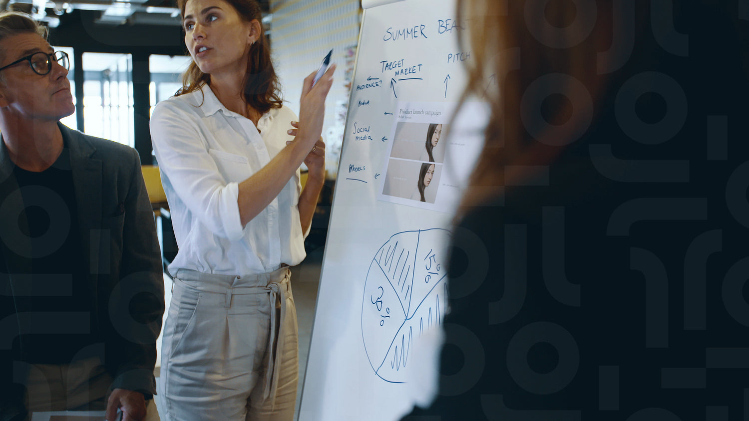 Businesswoman explaining the marketing strategy to the team in the office. Female executive writing on the whiteboard and explaining the project to associates in a meeting.