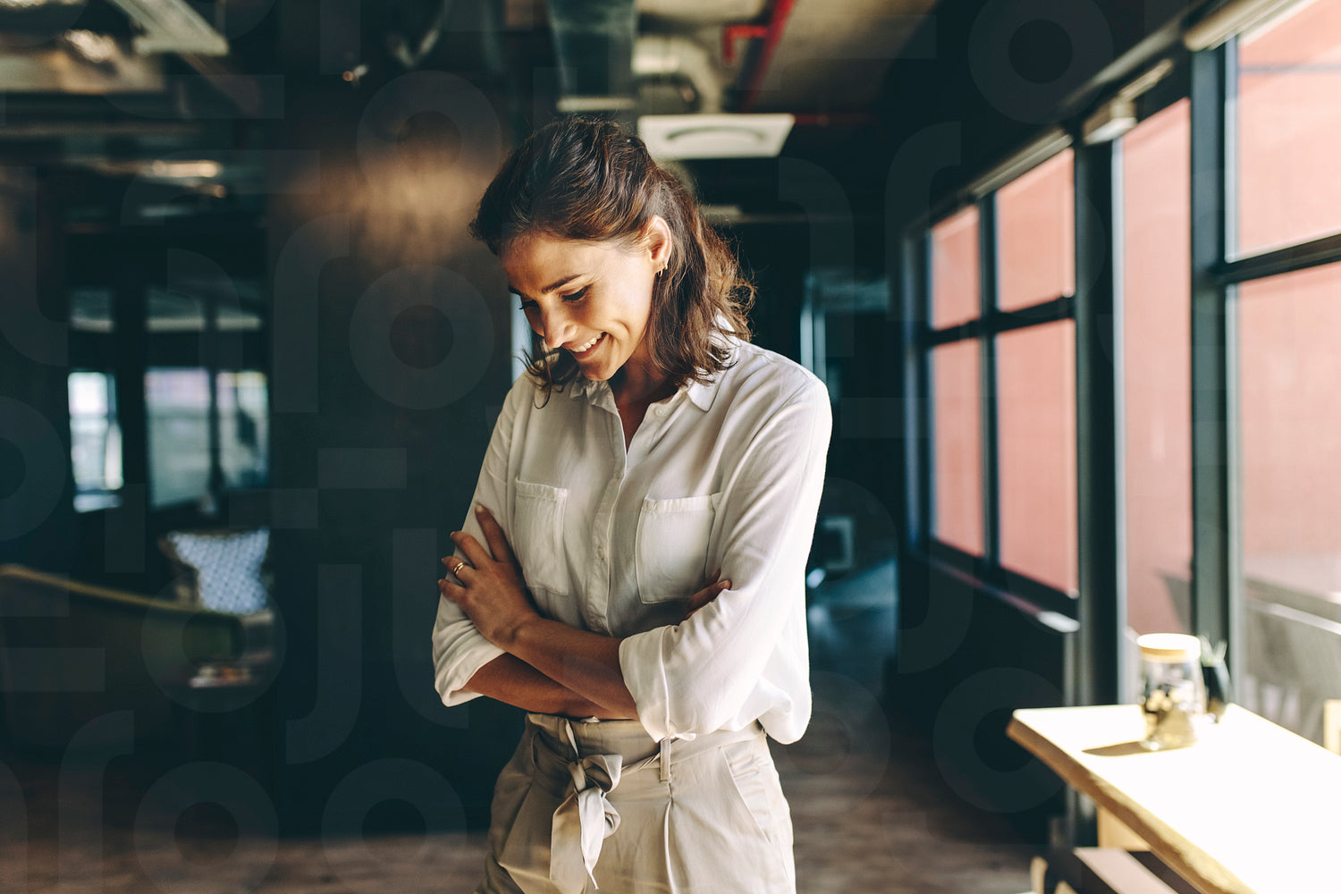 Woman standing in office with arms crossed looking down and smiling. Businesswoman looking happy in office.