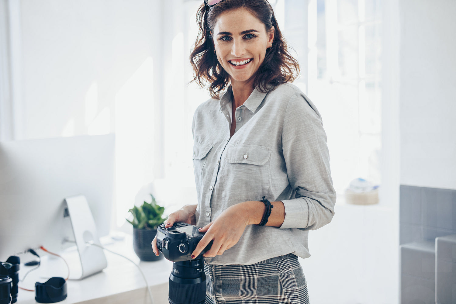 Confident female photographer with a professional camera. Woman with dslr camera in office.