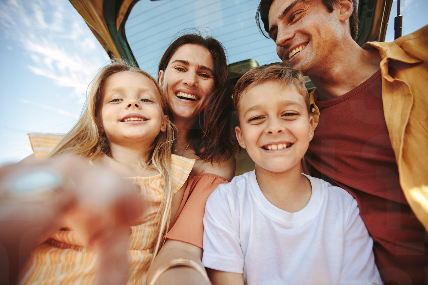 Taking a selfie from cellphone perspective. Happy family looking at camera taking a photo during vacation.