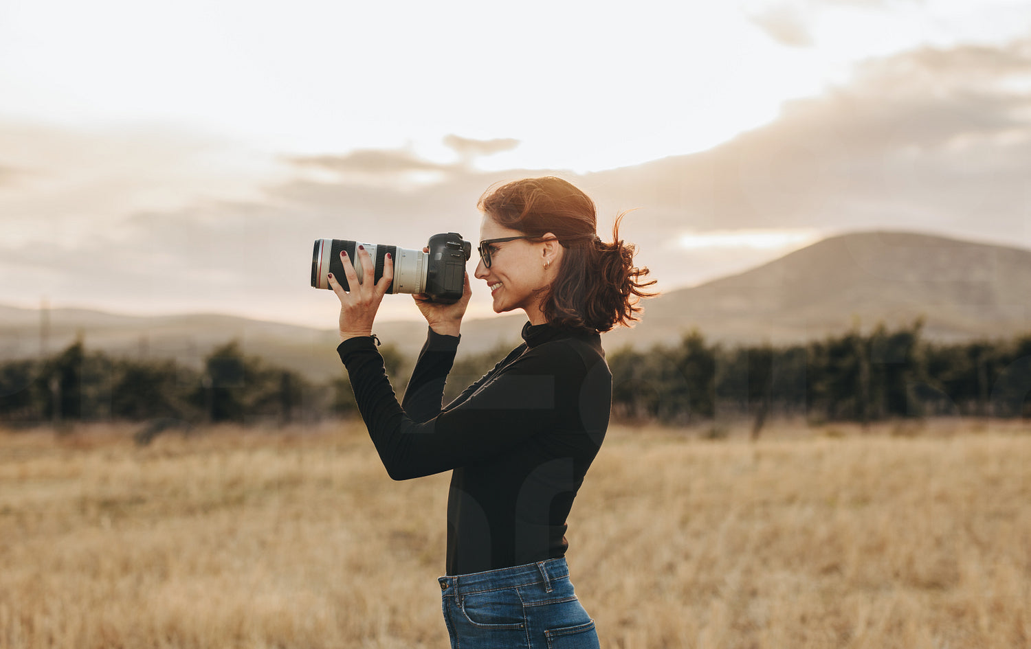 Side view of young female photographer shooting with dslr camera outdoors. Woman having a outdoors photo shoot.