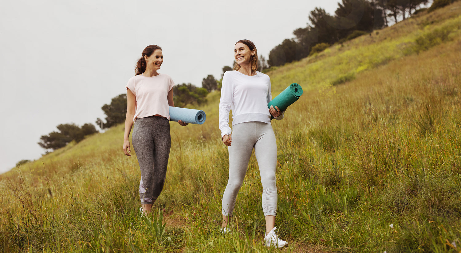 Fitness women walking outdoors with yoga mats. Smiling women friends walking in the park enjoying the nature.